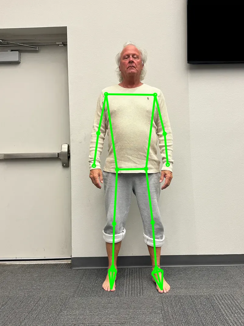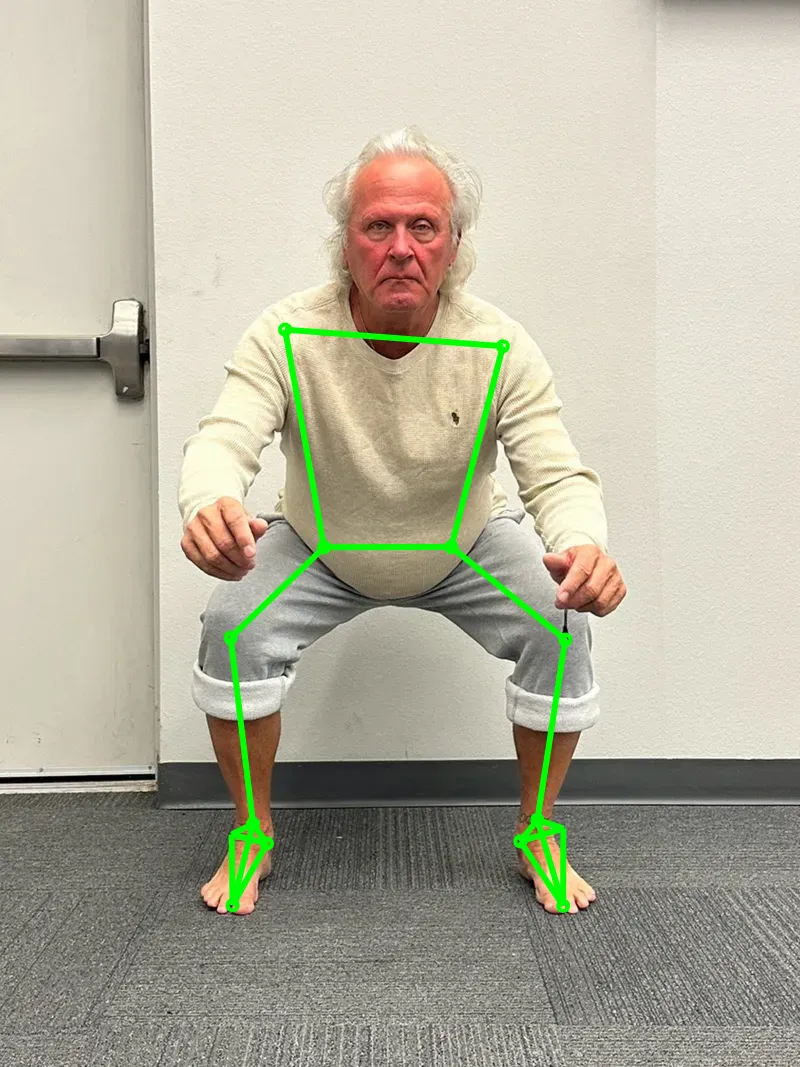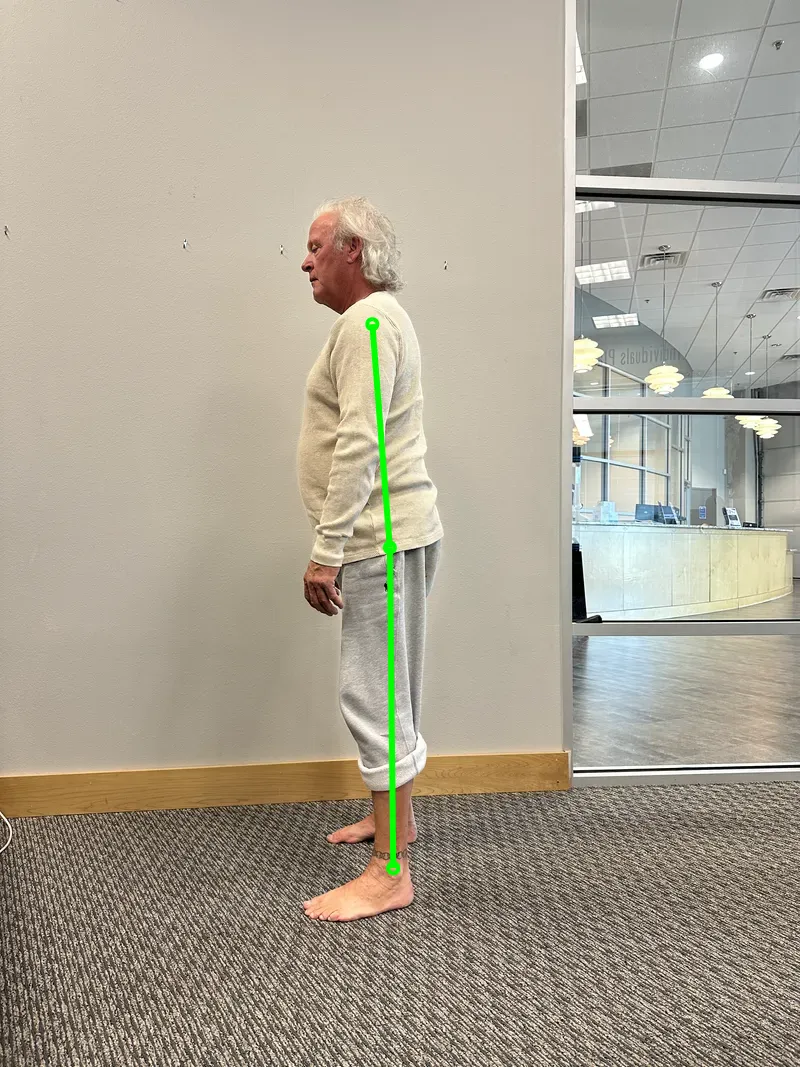 Your ankle/arch score is CAUTION. Your inner ankle-bone angle measures about 21.36° in standing and about 25.84° in the squat. Ideally, we want around 22° for a healthy arch shape. Your arch is collapsing slightly, causing the ankle to sink inward. This affects force transfer, sending stress up into your knees, hips, or back. Stabilizing your ankles will support your goal of becoming more durable by providing a stronger foundation.